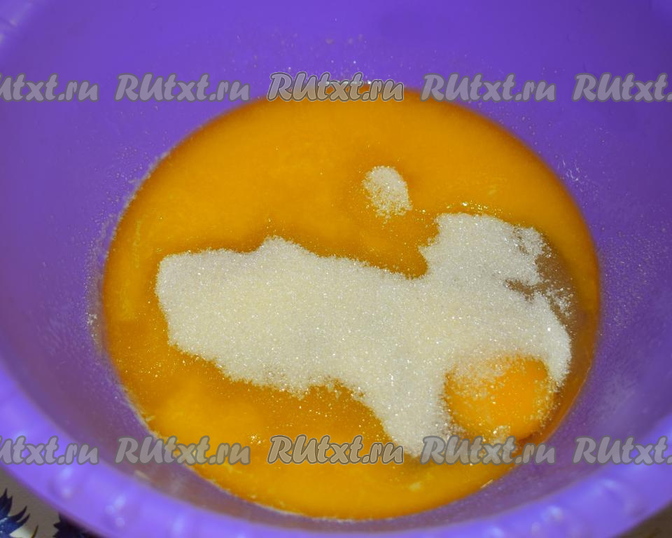 Далее насыпаем сахар и перемешиваем получившуюся массу.