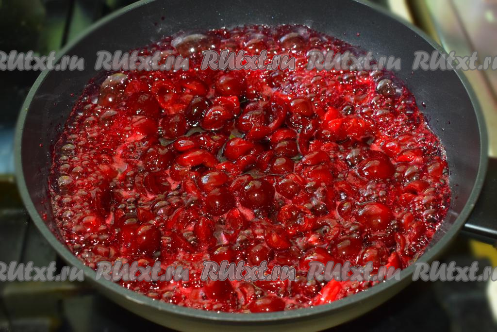 Включаем средний огонь и начинаем выпаривать сок из нашей начинки в течение минут 8, постоянно помешивая вишню.