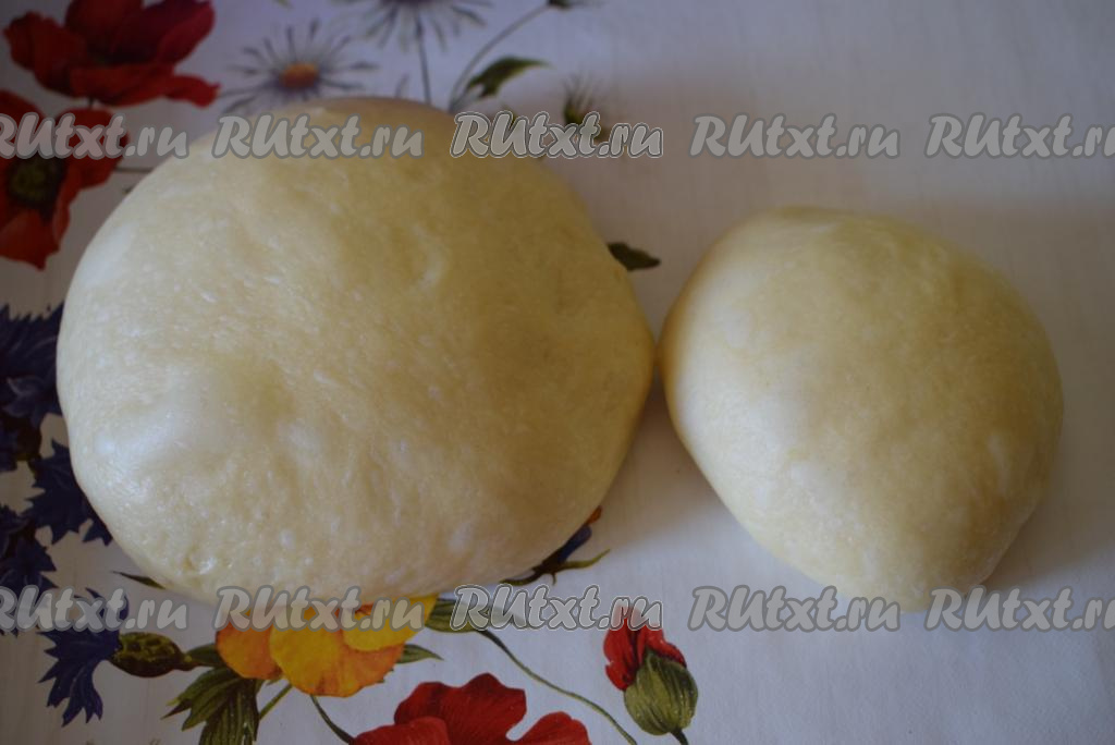 Приступаем к приготовлению нашего вишневого пирога. Для этого разделим подошедшее дрожжевое тесто на 2 части (большая часть теста станет основой пирога, маленькую часть теста будем использовать для оформления верха выпечки).