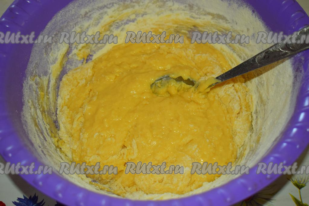 Перемешиваем все ингредиенты до однородности. Добавляем муку по одному стакану и перемешиваем, доводя тесто до плотной консистенции.
