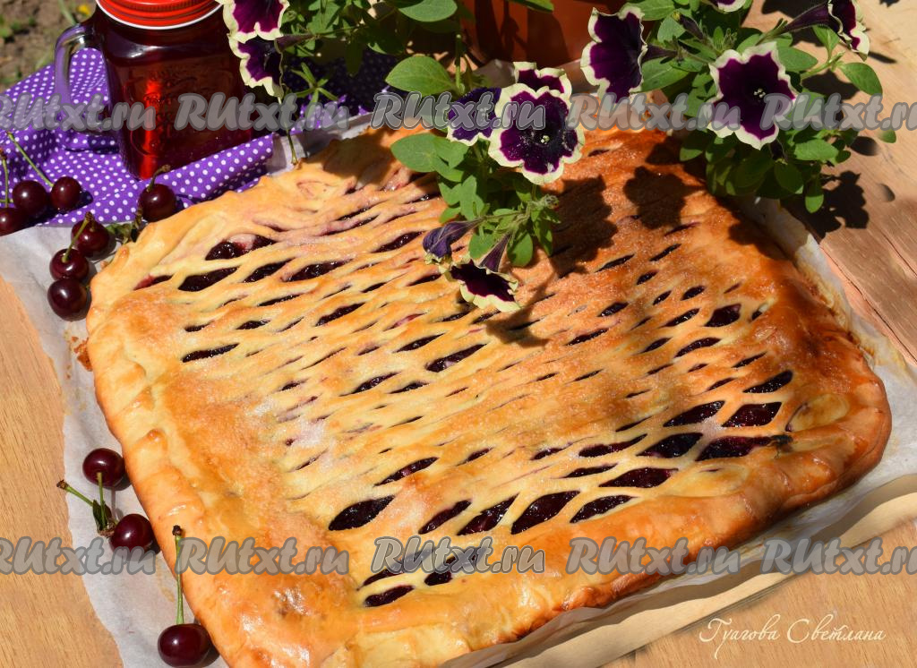 Подготовленный вишневый дрожжевой пирог ставим в разогретую духовку и выпекаем при температуре 180 градусов, примерно, 45 минут. Достаем наш ароматный пирог и накрываем его полотенцем, для того чтобы он стал мягким.
