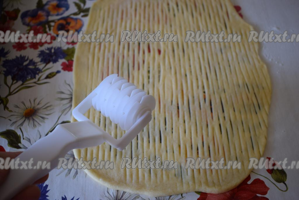 Далее оформляем верх пирога, для этого можно раскатать меньшую часть теста, нарезать жгутики и выложить сверху, образуя решетку, а можно воспользоваться специальным роликом для сеточки (как на фото).