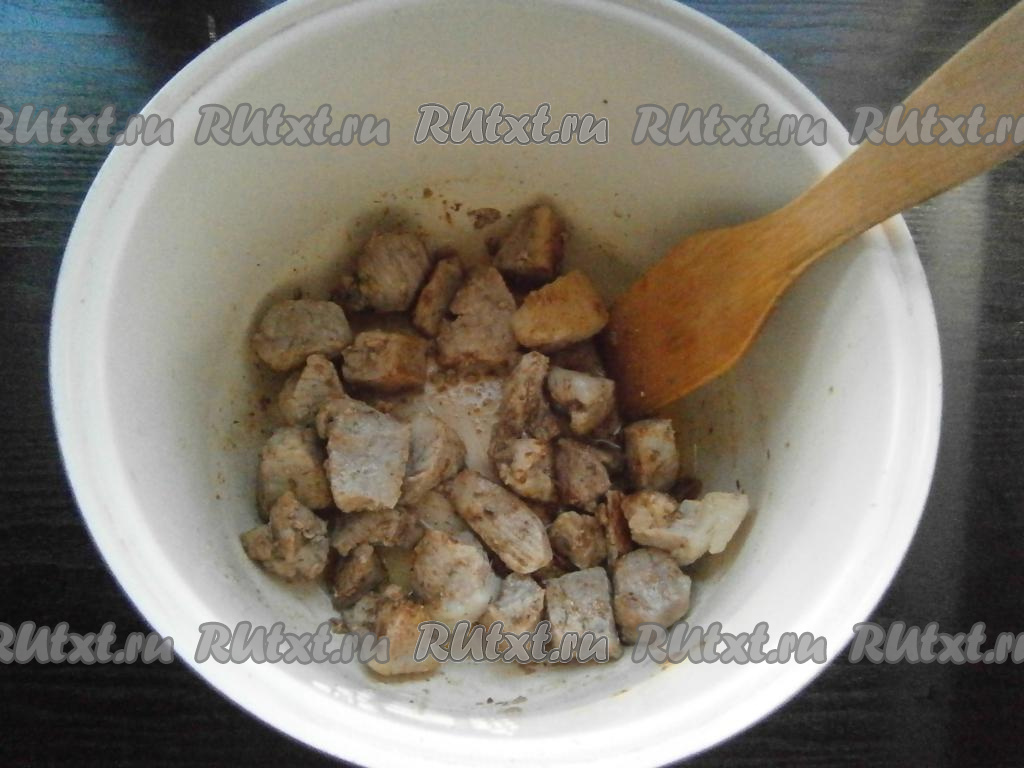 В чашу мультиварки влить растительное масло, выложить кусочки свинины, посыпать их хмели-сунели. Выставить режим "Выпечка" или "Жарка" на 20 минут. Обжаривать мясо, помешивая, 10 минут.