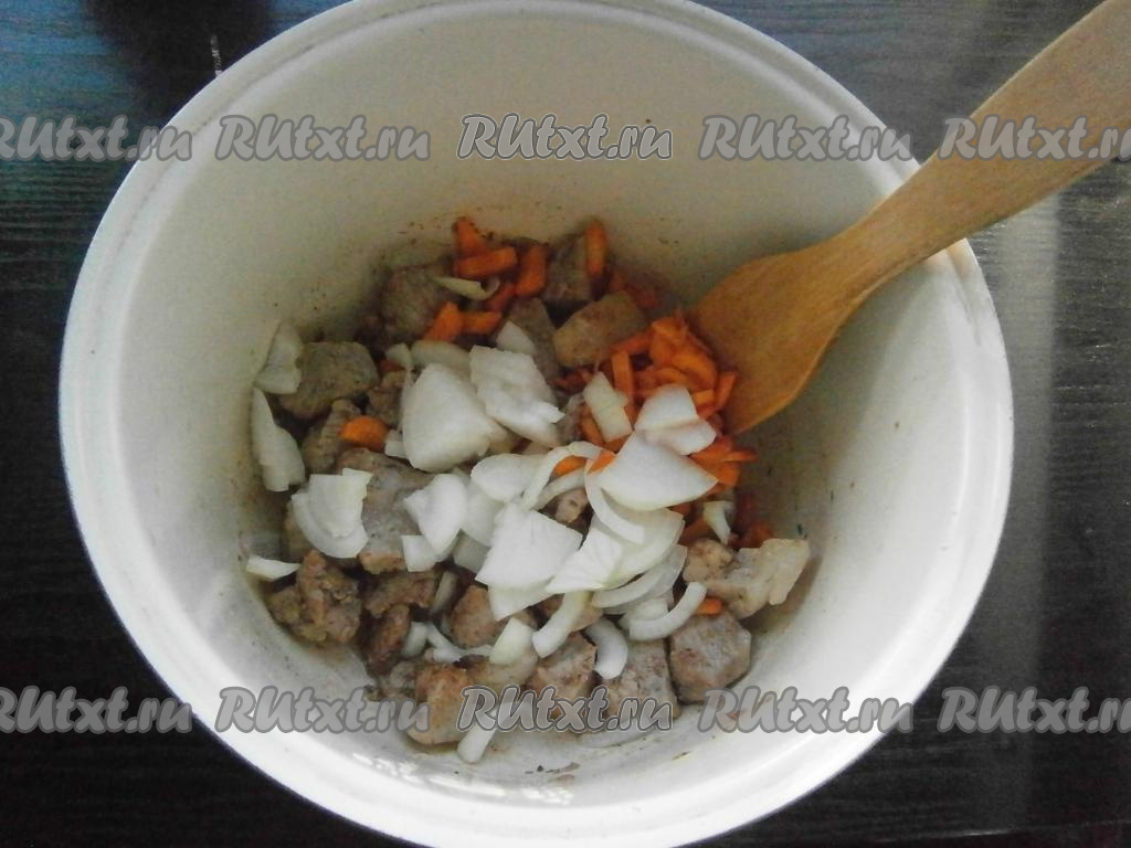 Далее добавить нарезанные произвольными кусочками репчатый лук и морковь, перемешать и готовить до сигнала (еще 10 минут).