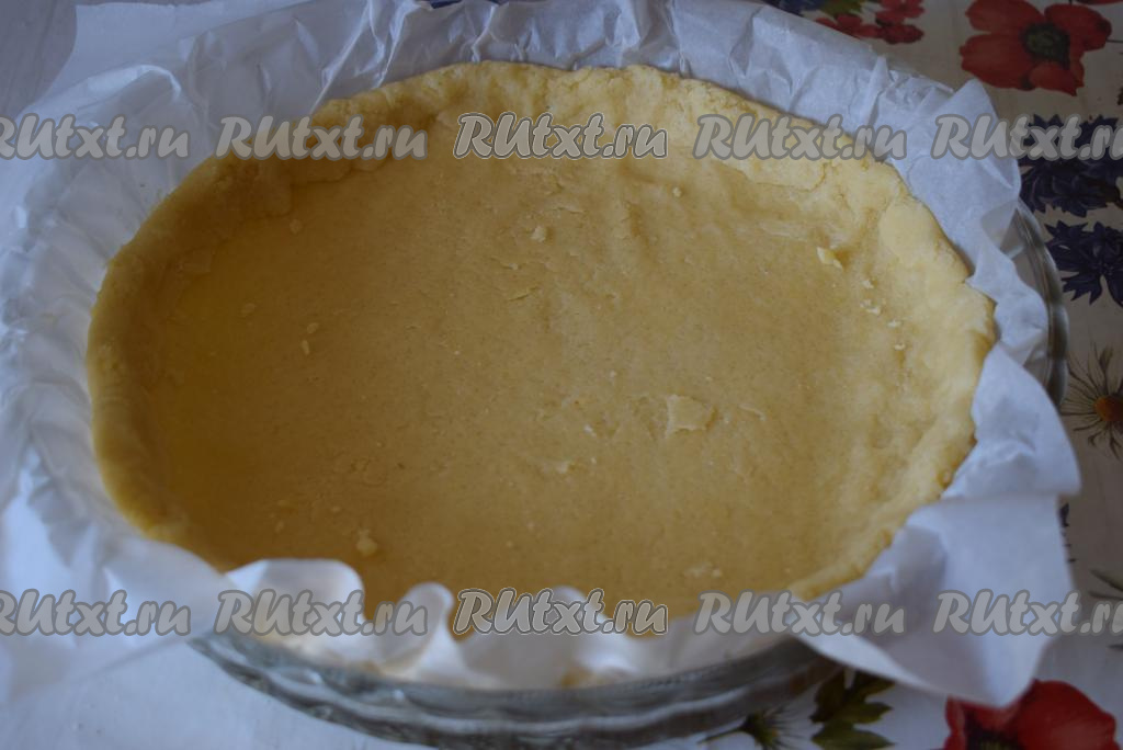 Далее достаем тесто из холодильника и на пергаментной бумаге раскатываем его в круг, диаметр которого на 2 см больше диаметра формы для выпечки. Диаметр моей формы 26 см. Выкладываем пергамент с тестом в форму и аккуратно уплотняем бортики руками.