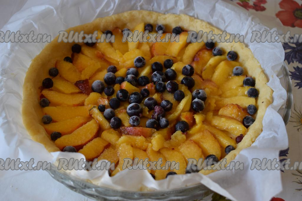 Сахар для начинки смешиваем с крахмалом и посыпаем фрукты и ягоды этой смесью. Ставим наш пирог в духовку (если вы печете в стеклянной форме, то ставьте пирог в холодную духовку, если в металлической - то в разогретую). Выпекать пирог с нектаринами надо при температуре 180 градусов, примерно, 45 минут с момента разогрева духовки. Достаем очень красивый, ароматный и вкусный пирог из духовки и охлаждаем его.