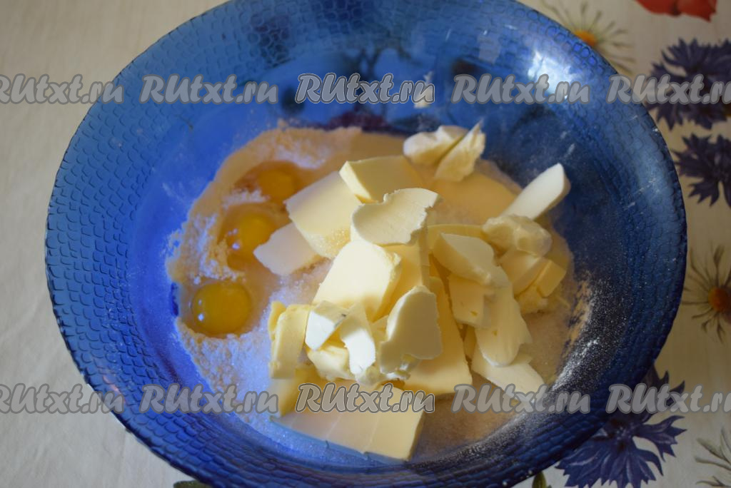 Нарезаем охлажденное сливочное масло на кусочки и добавляем в миску.