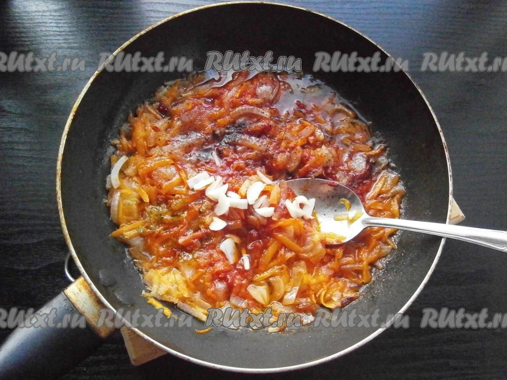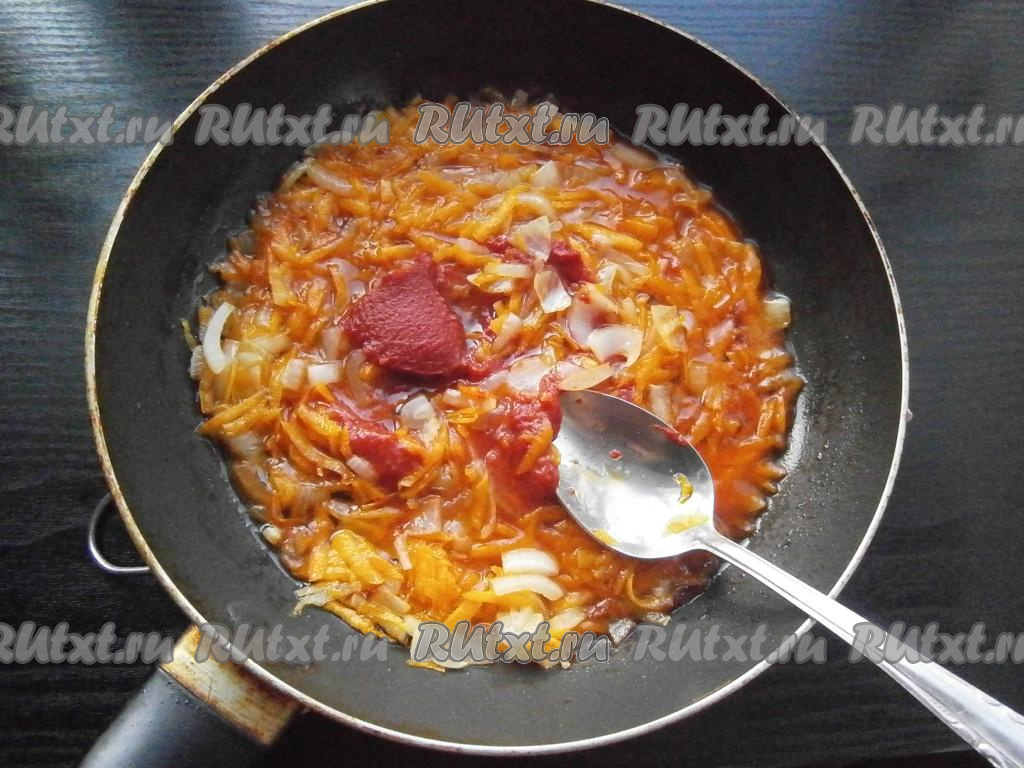 Обжарить лук с морковью, помешивая, до мягкости, затем добавить томатную пасту.