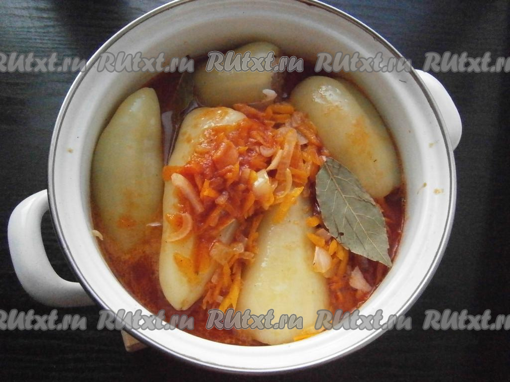 Готовый томатный соус вылить в кастрюлю с фаршированными перцами, добавить лавровый лист.