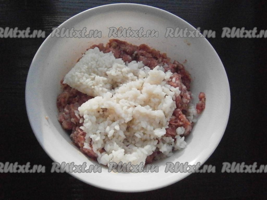 Хорошенько перемешать и добавить предварительно отваренный до полуготовности и остуженный рис, ещё раз хорошо перемешать фарш.