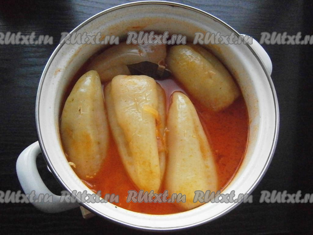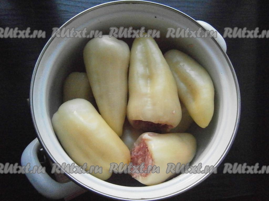 Сложить фаршированные перцы в кастрюлю, влить 200 мл подсоленной горячей воды, поставить на небольшой огонь и, накрыв крышкой, протушить около 10 минут.