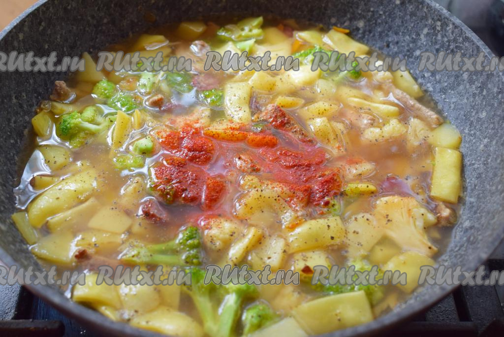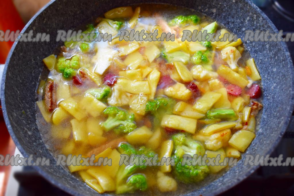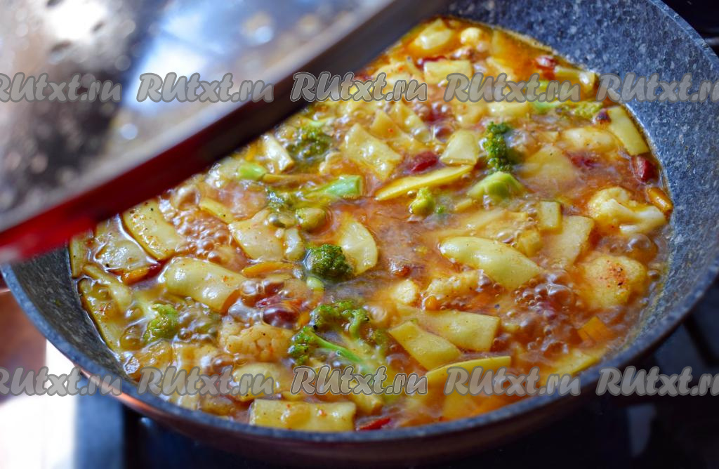 Накрываем сковороду крышкой, доводим до кипения, уменьшаем огонь до минимального и начинаем тушить наш суп "Айнтопф".