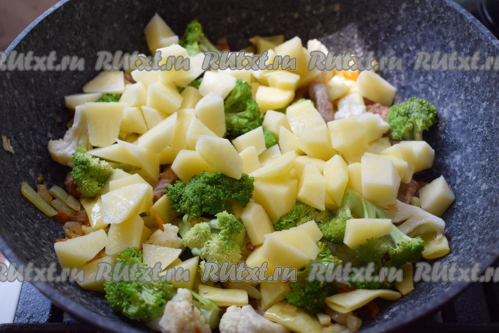 Обжариваем все ингредиенты под крышкой, примерно, 10 минут, не забывая периодически перемешивать. К обжаренным овощам кладем картофель.