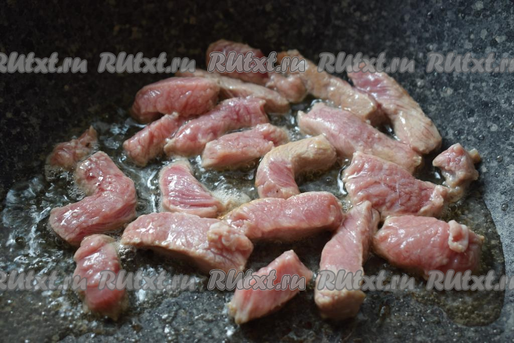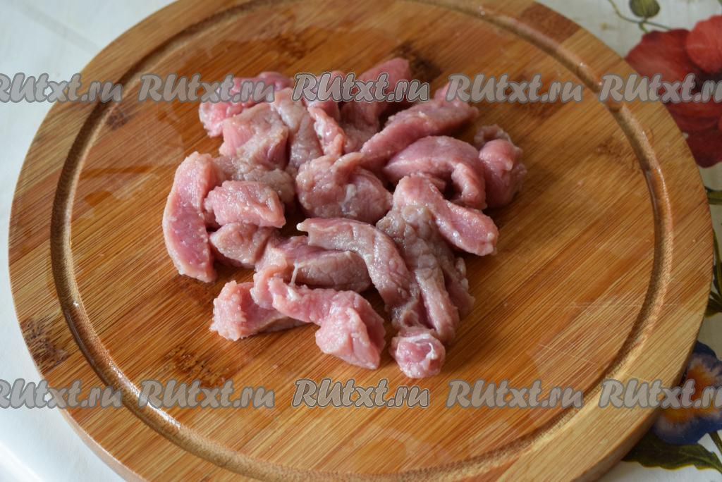 Мясо нарежем на полоски размером 1,5 на 3 см.