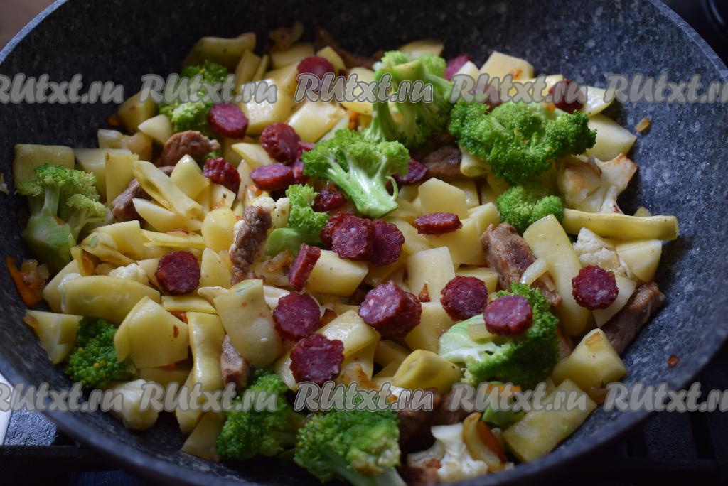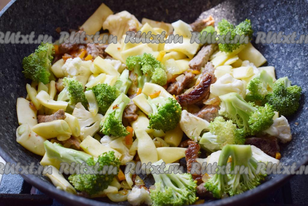 Добавляем в сковороду цветную капусту, брокколи и нарезанную фасоль.