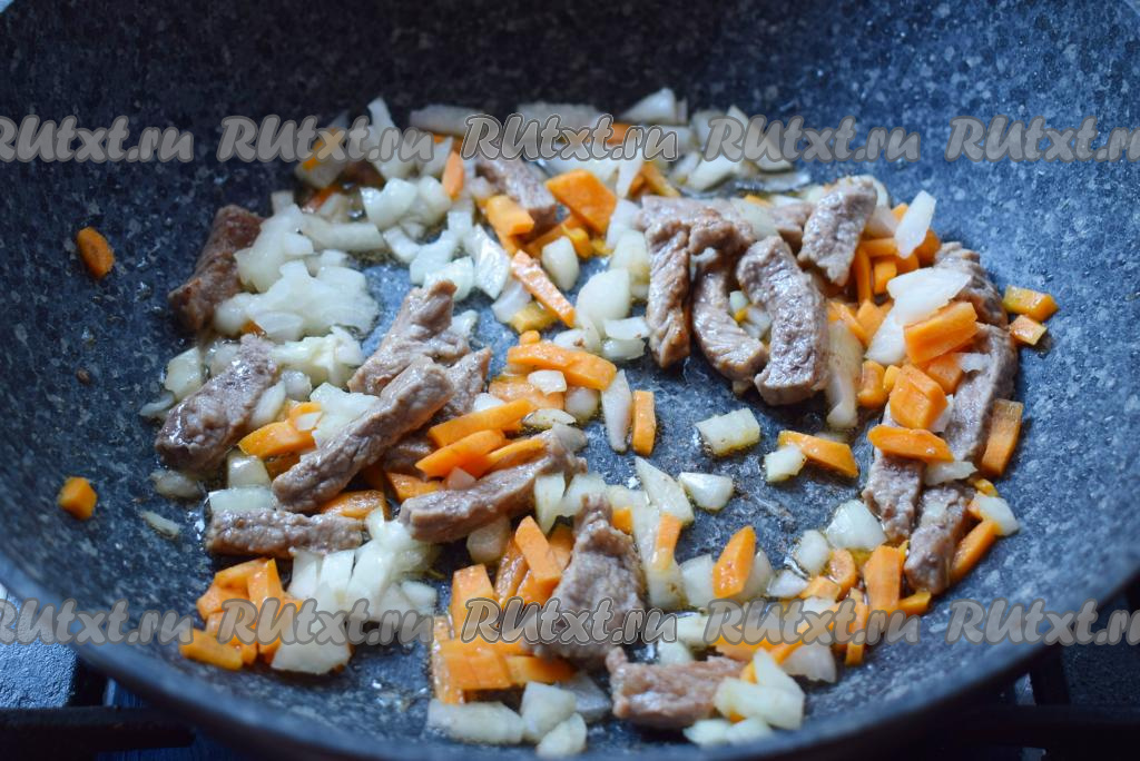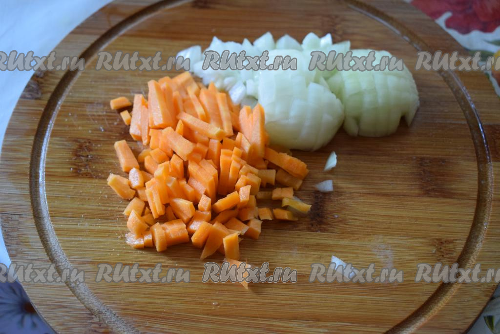 Пока говядина обжаривается, очистим и нарежем мелко лук и морковь.