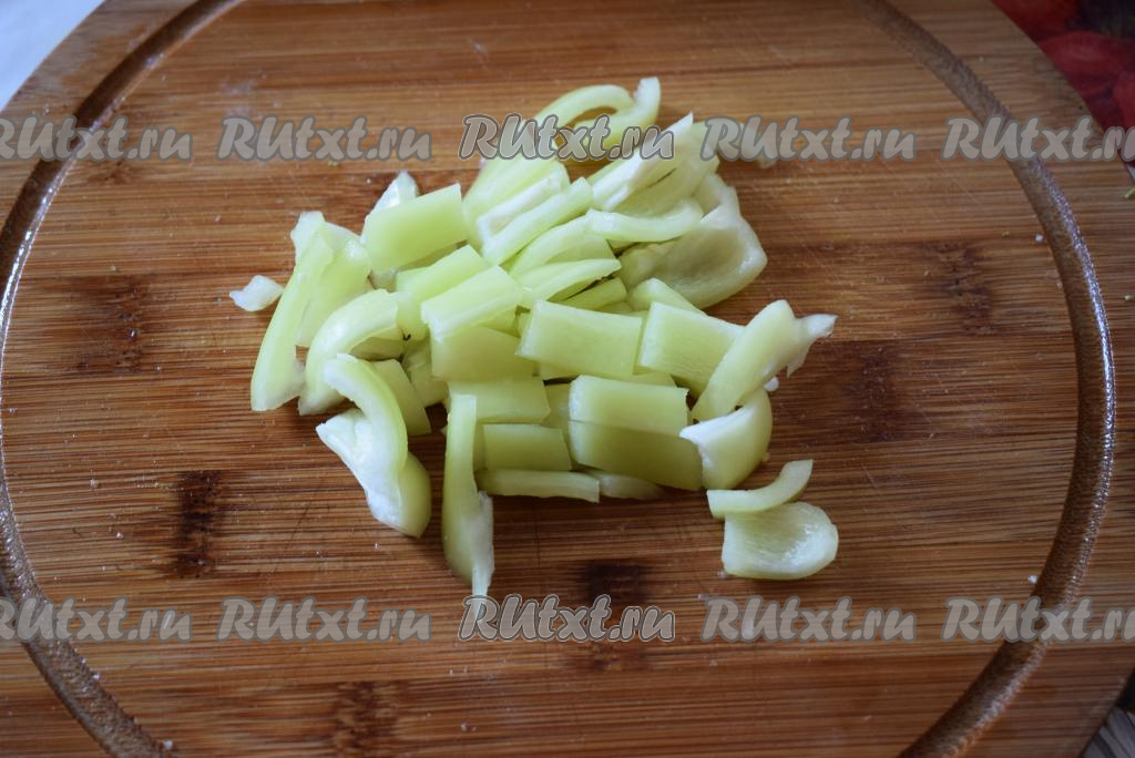 Болгарский перец, очистив от семян, нарезаем соломкой.