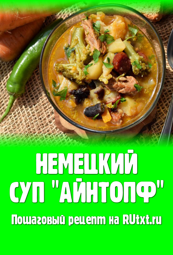 Немецкий суп "Айнтопф" - это густое, наваристое блюдо. По сути, этот супчик является и не первым, и не вторым блюдом, так как для супа он густоват, а для второго блюда все-таки жидковат. Это очень вкусный, многокомпонентный суп, который не готовят по строгому рецепту. "Айнтопф" - это, скорее, кулинарная идея, чем рецепт. В классическом варианте в него кладут мясо различных видов, бобовые, капусту различных сортов, овощи, грибы и копченые колбаски. В переводе с немецкого "айнтопф" означает "один горшок", так как для приготовления этого супа используется одна толстостенная посуда, в которой и жарят, и варят все ингредиенты. Рекомендую попробовать этот насыщенный и очень вкусный суп, я думаю, вы останетесь довольны, тем более, что каждый раз можно менять ингредиенты и подстраивать его под свой индивидуальный вкус.