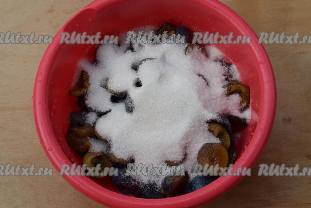 Засыпаем половинки слив сахаром и оставляем на пару часов, чтобы плоды пустили сок.