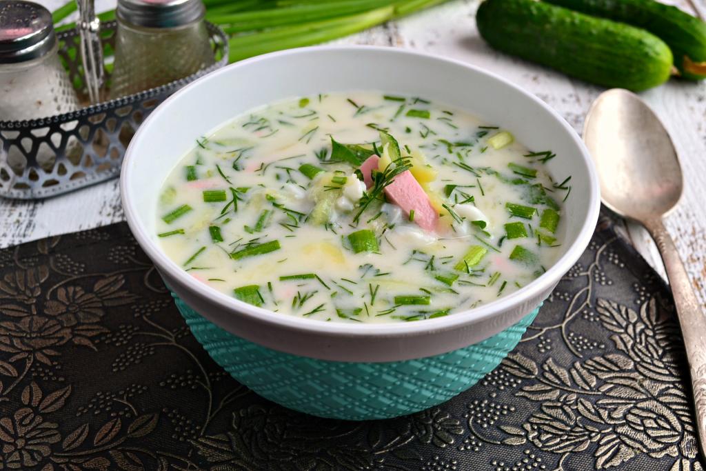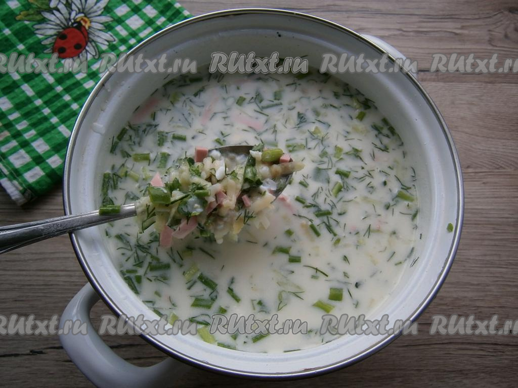 Разбавить блюдо сывороткой до нужной вам густоты. Окрошку посолить, всыпать немного сахара, перемешать и охладить.