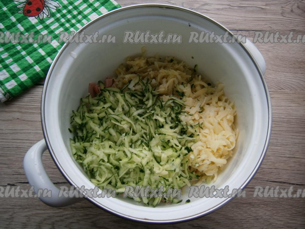 Картофель очистить и натереть на крупной терке вместе со свежими огурцами, выложить к колбасе.