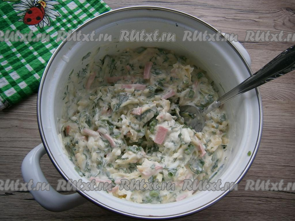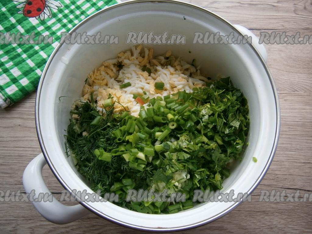 Добавить натертые вареные яйца и мелко нарезанные зелёный лук, укроп, петрушку.