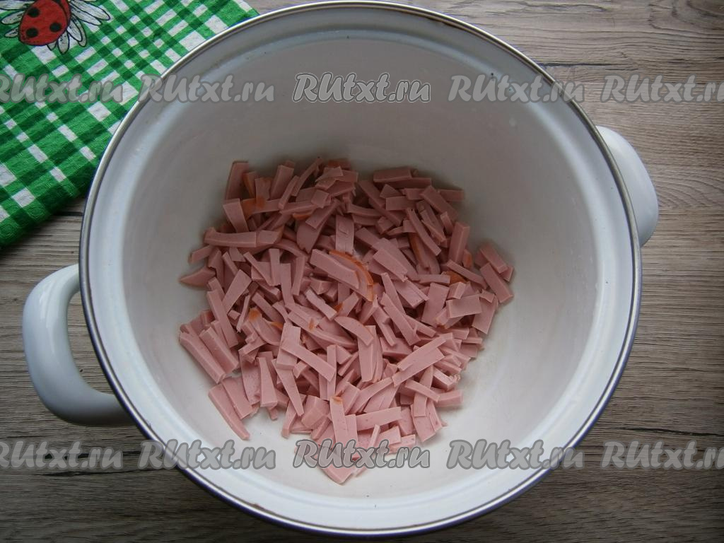 Вареную колбасу нарезать тонкими брусочками (или соломкой), можно натереть и на крупной терке.