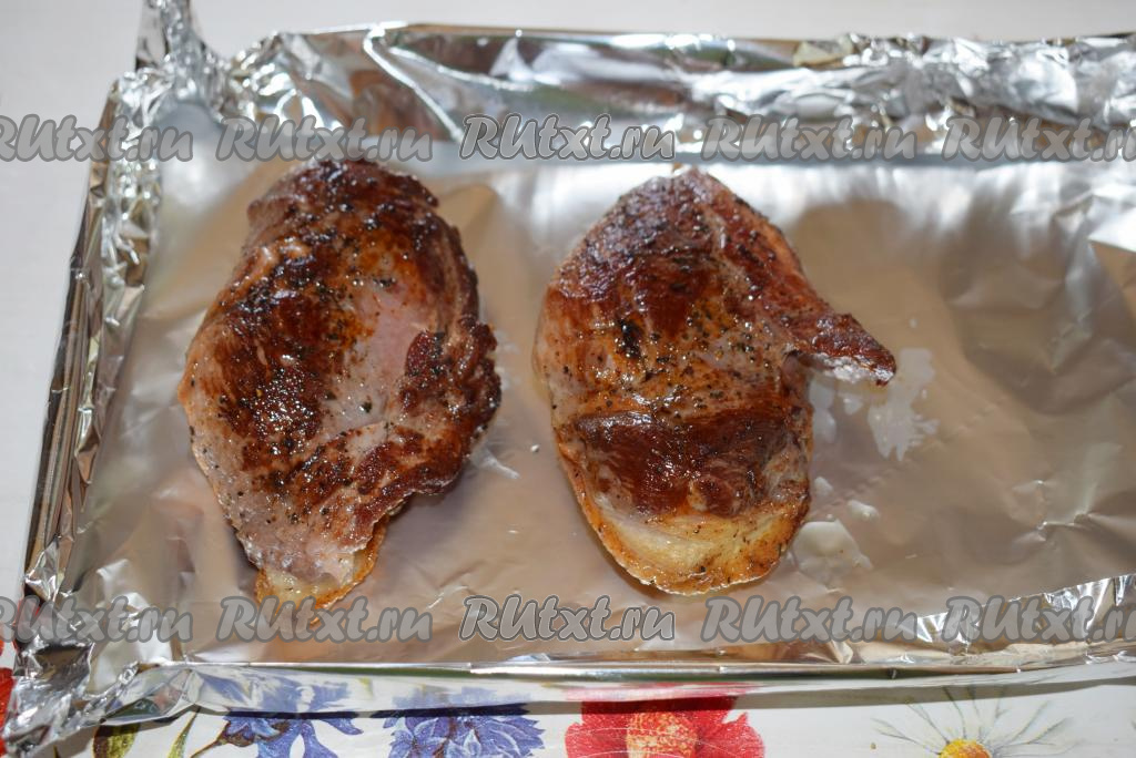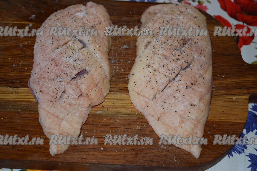 Готовые грудки достаем из фольги и нарезаем на порционные кусочки.