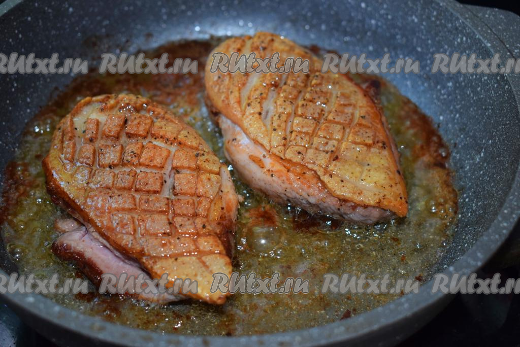 Затем переворачиваем грудки и обжариваем их в вытопившемся жиру еще 3-5 минут (до подрумянивания). Можно обжаривать утиные грудки и в мультиварке, но по времени приготовления так получится дольше, так как чашу мультиварки после жарки грудок надо будет вымыть (а для этого её нужно будет вначале немного охладить) и затем уже в вымытой чаше запекать мясо. Пока же грудки обжариваются на сковороде, можно включить мультиварку на разогрев и, как только мясо обжарилось, сразу отправить запекаться в мультиварку.