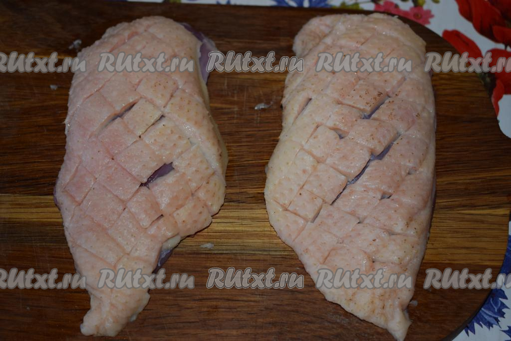Надрежем ножом кожицу утки ромбиками (ка на фото) так, чтобы не касаться мяса.