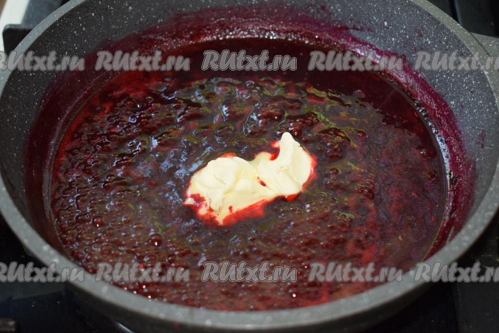Венчиком перемешиваем соус до растворения комочков муки. Доводим соус до закипания и выключаем огонь. В горячий ежевичный соус добавляем кусочек сливочного масла и хорошо перемешиваем.