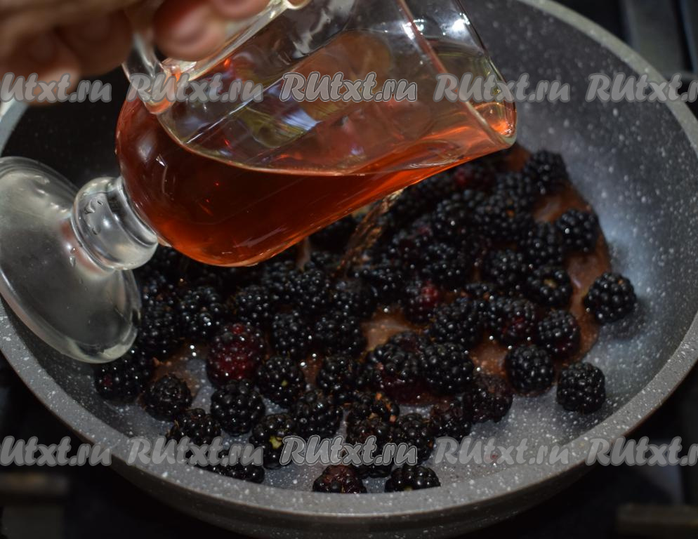 Получившийся соус из ежевики опять отправляем на сковороду (или в кастрюлю) и ставим на медленный огонь.