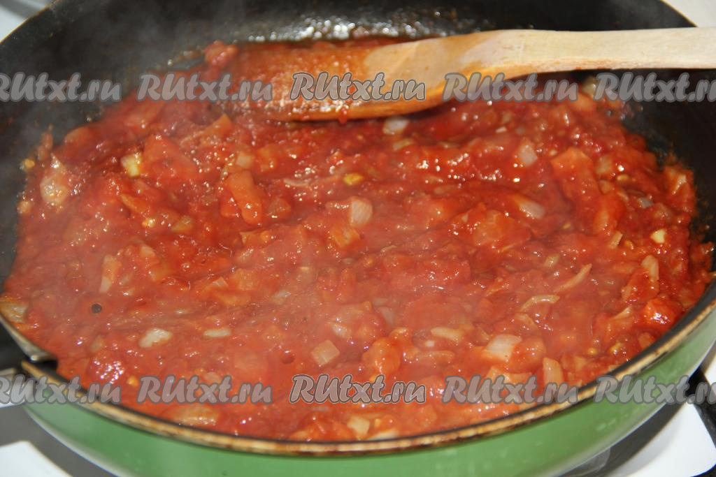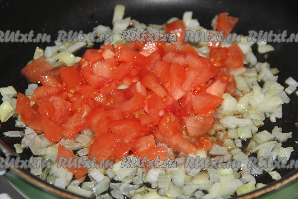 Мелко нарезать очищенный от шкурки помидор и добавить в сковороду к луку. Обжарить овощи, помешивая, в течение 3-5 минут на среднем огне.