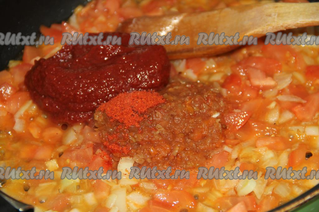 В сковороду с овощами добавить томатную пасту, аджику и паприку.