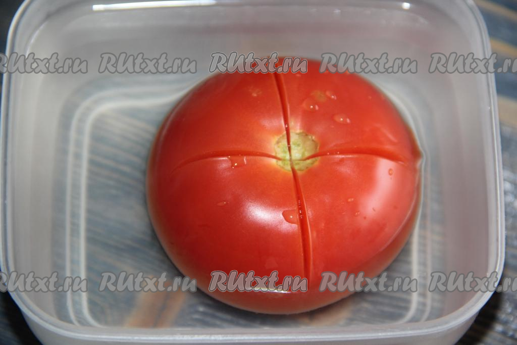 Помидорчик вымыть, сделать крестовой надрез и ошпарить кипятком.