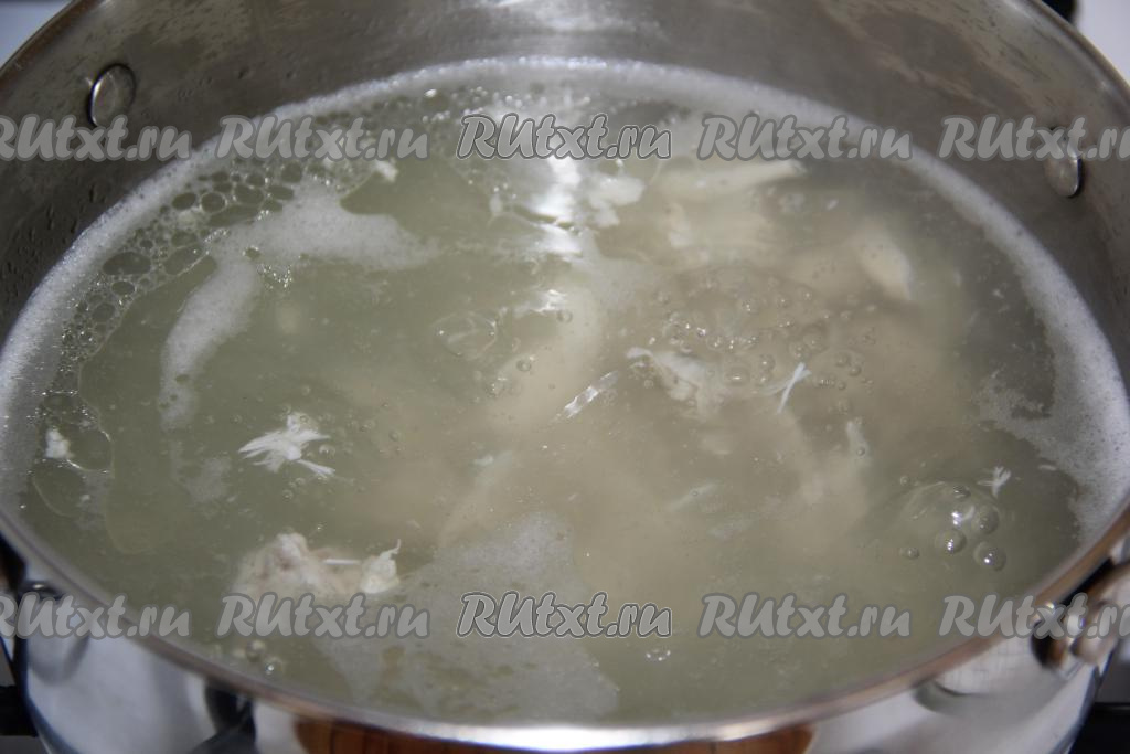 В кастрюлю выложить части курицы, залить водой и поставить на огонь. После закипания уменьшить огонь, снять пену и варить мясо минут 30 с момента закипания. Затем вынуть мясо, отделить его от костей и вернуть в кастрюлю с бульоном, довести до кипения.