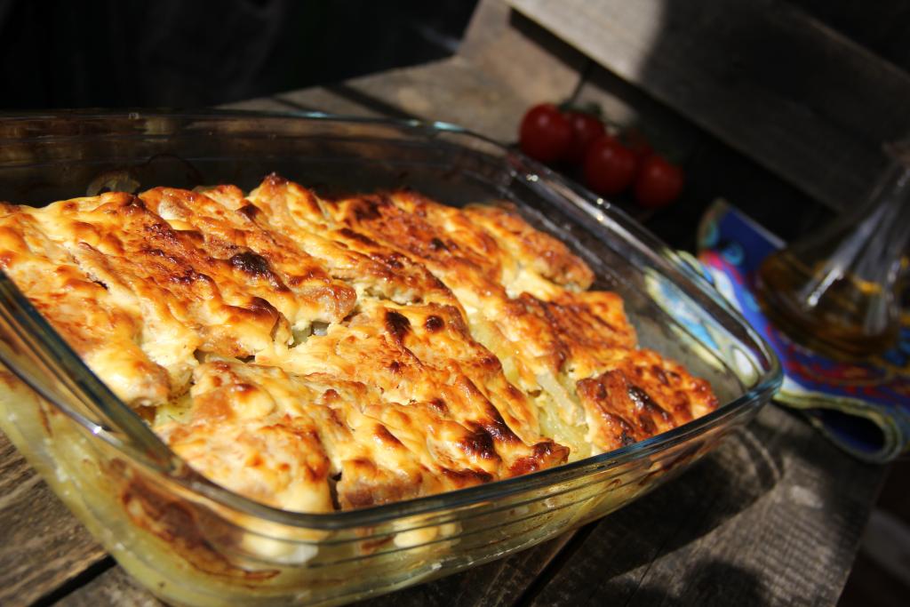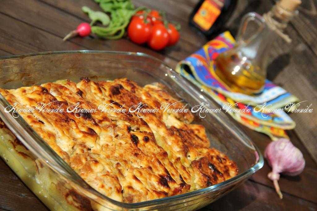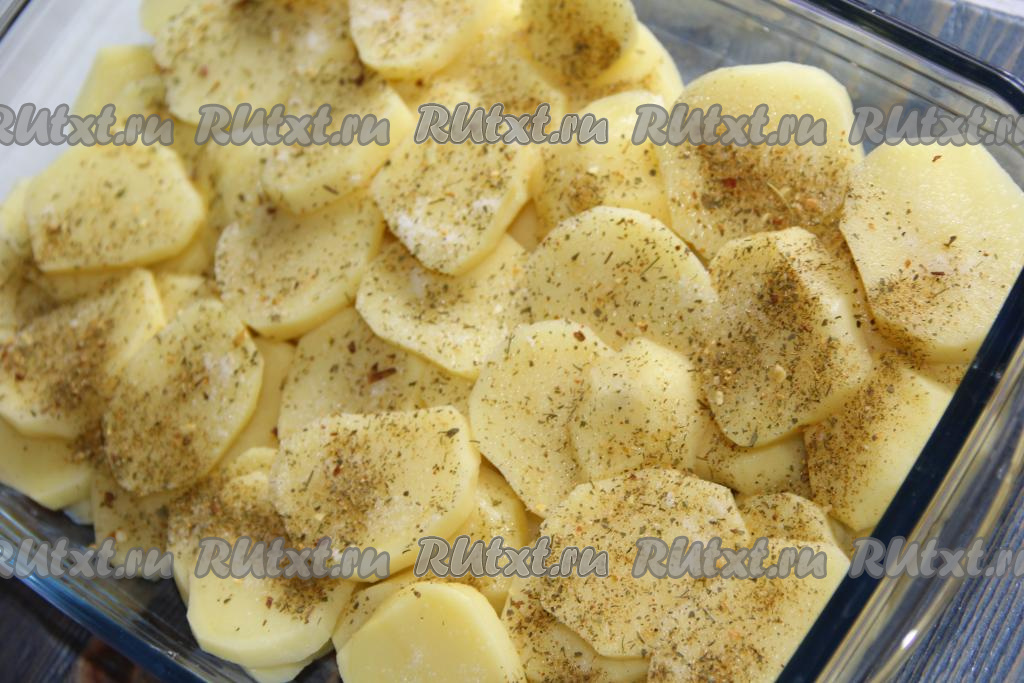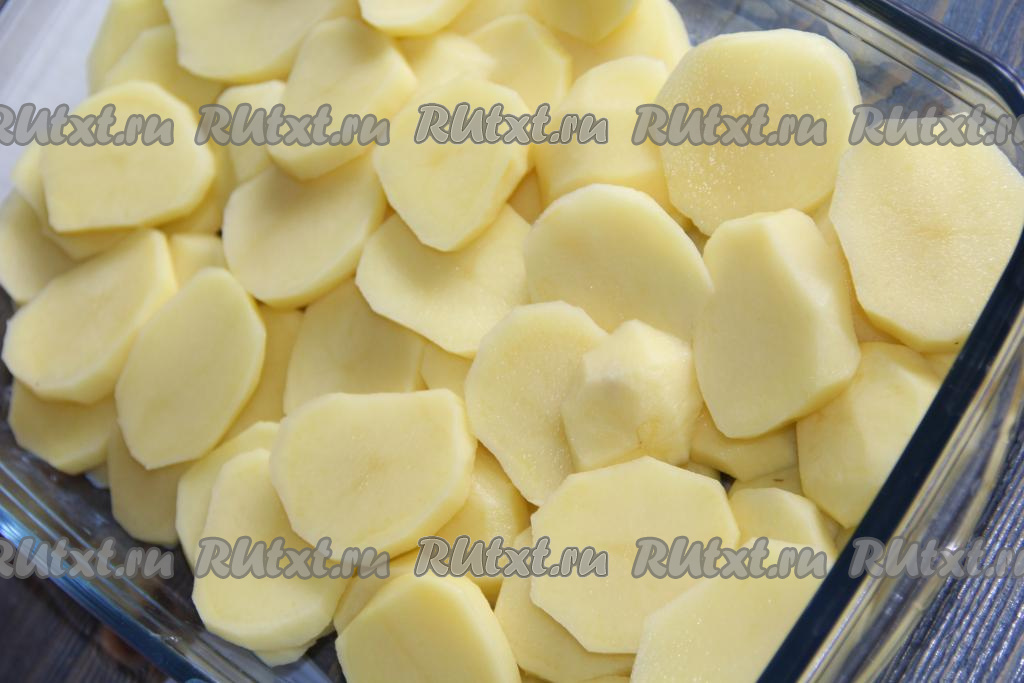 Нарезать картофель кружочками толщиной 0,5 см. Выложить картошку в жаропрочную форму. Дно формы можно не смазывать маслом.