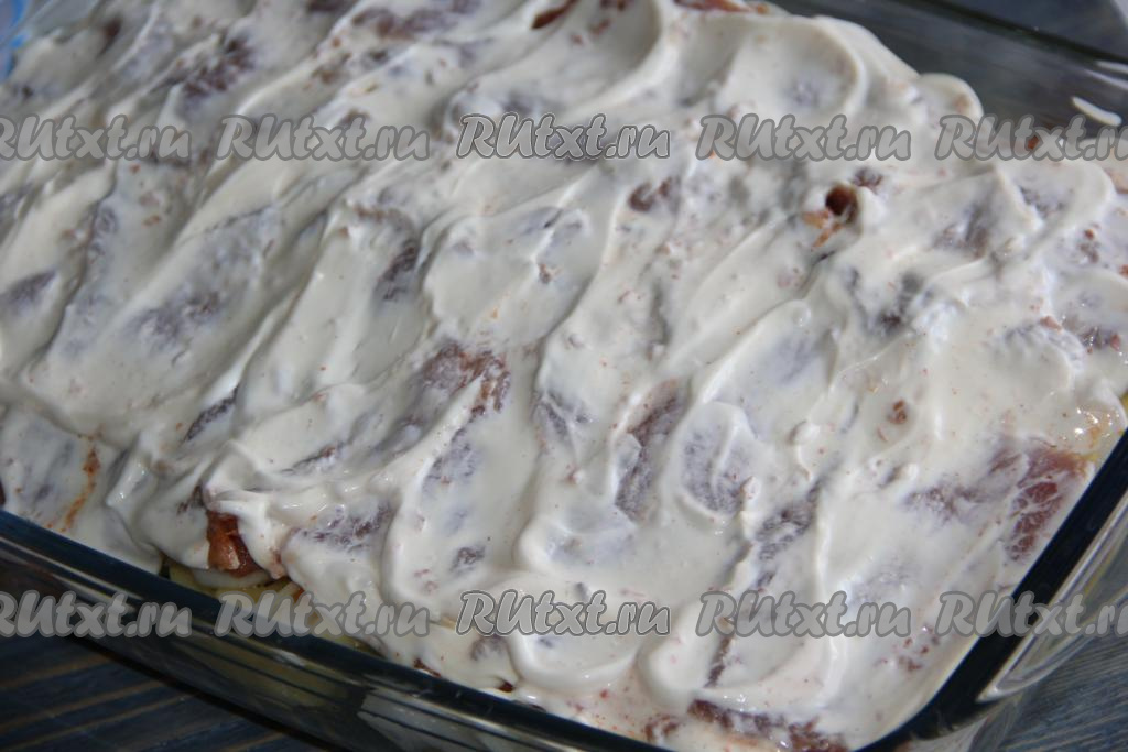 Затем выложить кусочки замаринованной свинины. Соединить майонез со сметаной и хорошо перемешать.