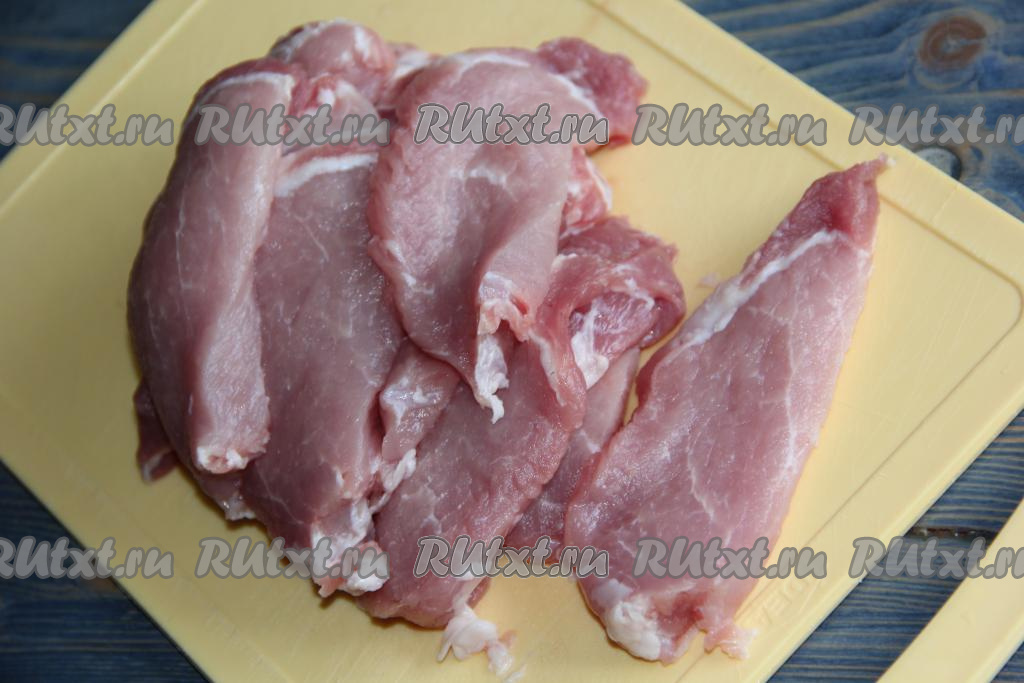 Для начала нужно нарезать свинину на кусочки толщиной в 1 см.