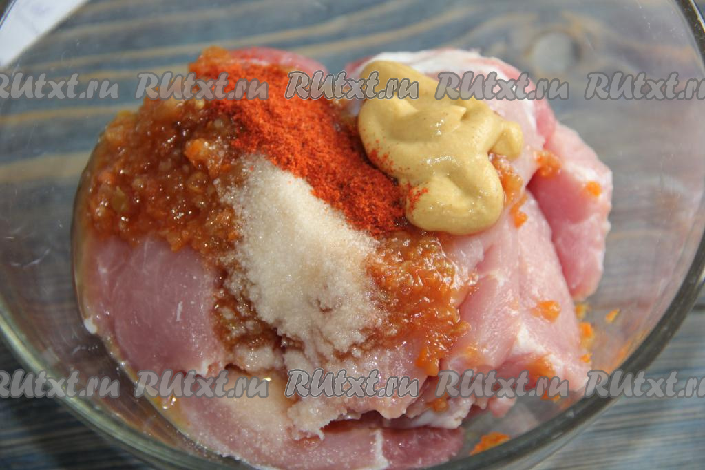 Тщательно смазать кусочки мяса маринадом и оставить на пару часов (можно на ночь) в холодильнике.