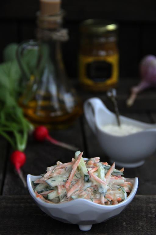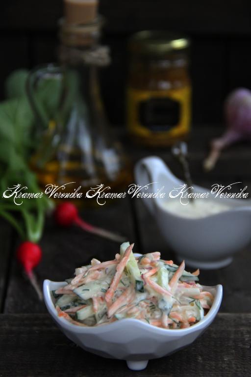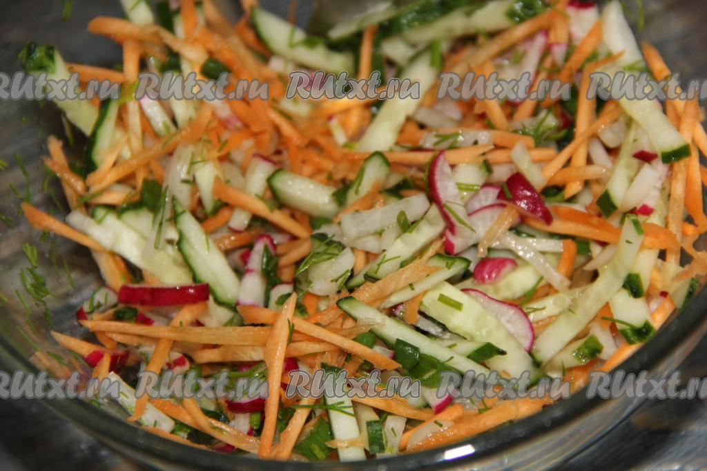Подать вкусный, пикантный салат из моркови, редиса и огурца к столу.