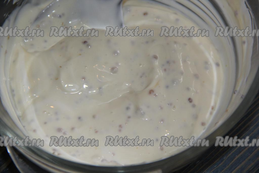 Для приготовления заправки соединить сметану, майонез, горчицу и чеснок, предварительно очищенный и пропущенный через пресс.