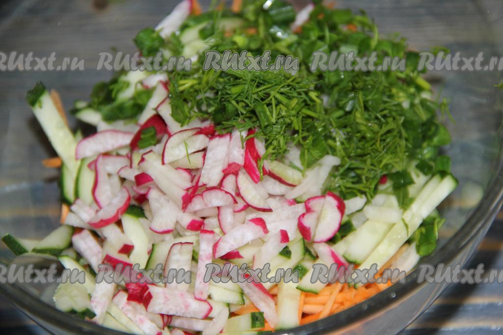 Зелень вымыть, обсушить и мелко порубить. Соединить морковь, огурцы, редиску и зелень.