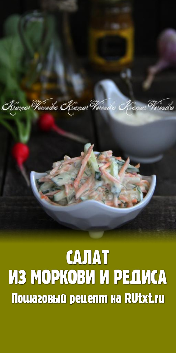 Летом и весной часто делаю этот вкусный, хрустящий салат из моркови и редиса. Готовится он очень быстро, ведь все овощи в этом блюде сырые. Но главное в этом салате - заправка! Она получается нежной и пикантной. Попробуйте приготовить салат по этому рецепту, он, наверняка, вам понравится и порадует приятным вкусом!