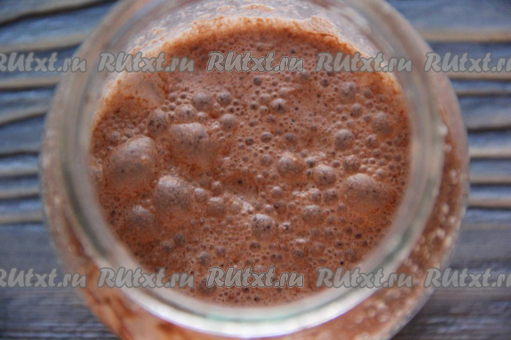 В чашу блендера влить молоко и добавить шоколадную пасту. Взбить массу до однородного состояния.