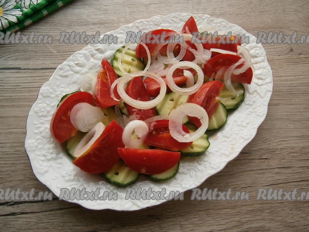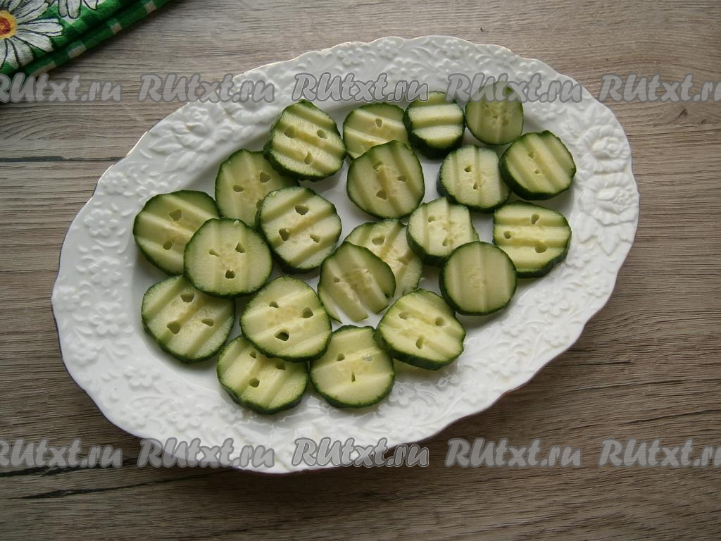Все овощи вымыть, репчатый лук очистить от шелухи и тоже вымыть. На овальное блюдо нарезать свежие огурцы кружками средней толщины в один слой.