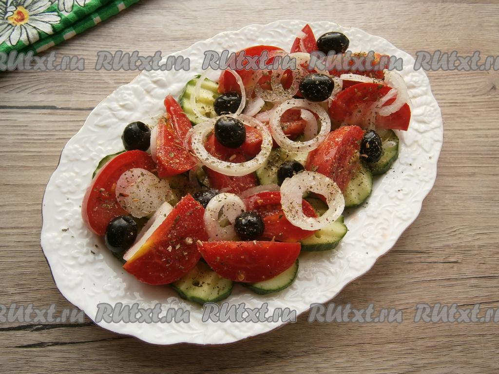 Далее выложить маслины, полить салат оливковым маслом, сбрызнуть лимонным соком и посыпать сушеным орегано.