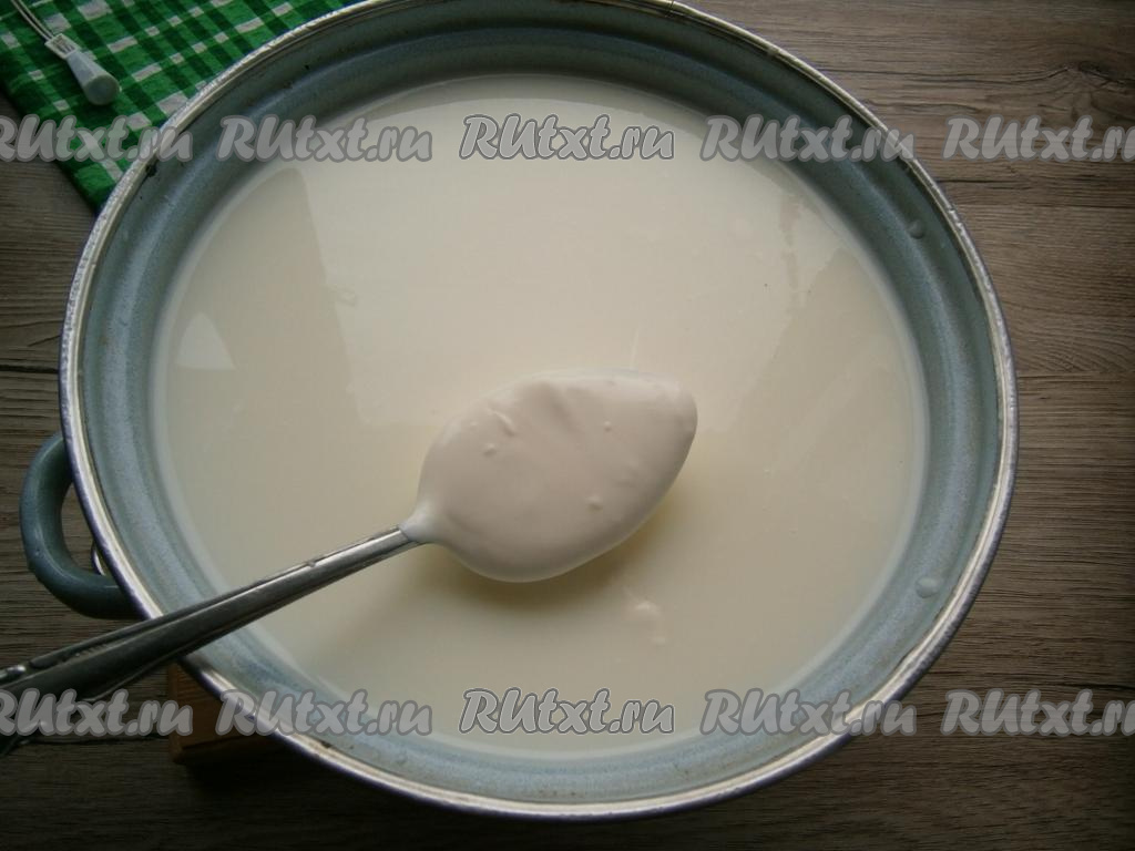 Молоко комнатной температуры влить в кастрюлю, добавить сметану, перемешать. Сметана в молоке полностью не растворится - ничего страшного.