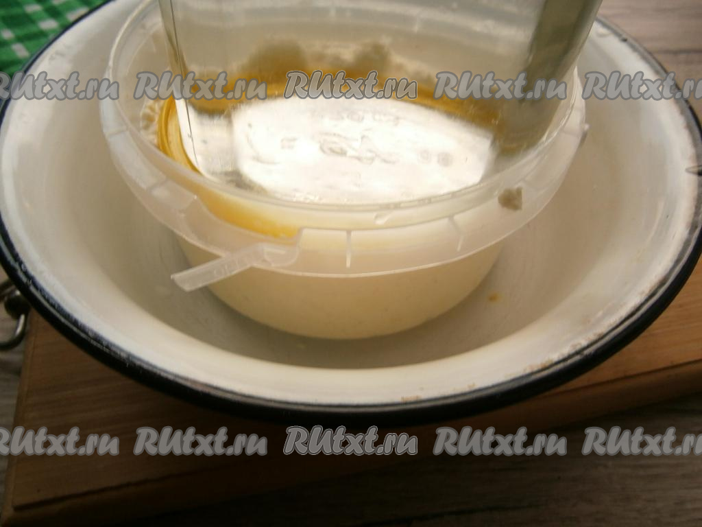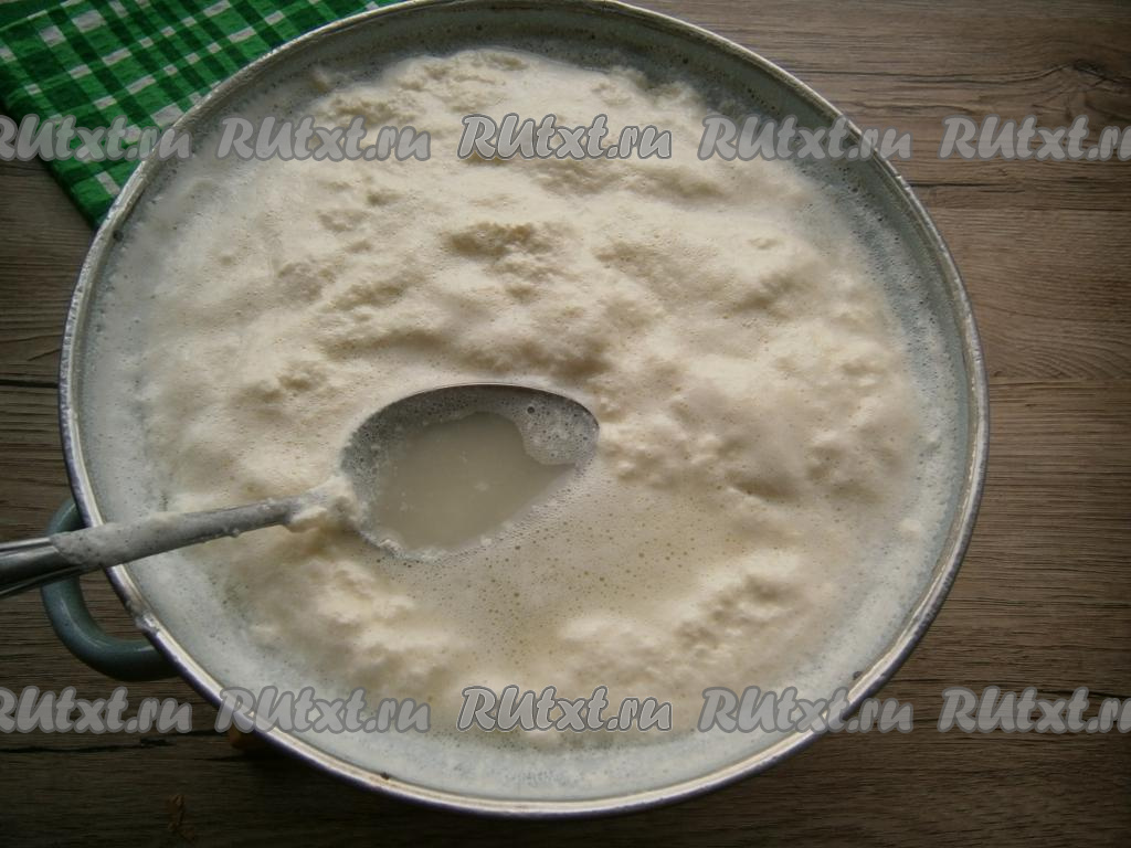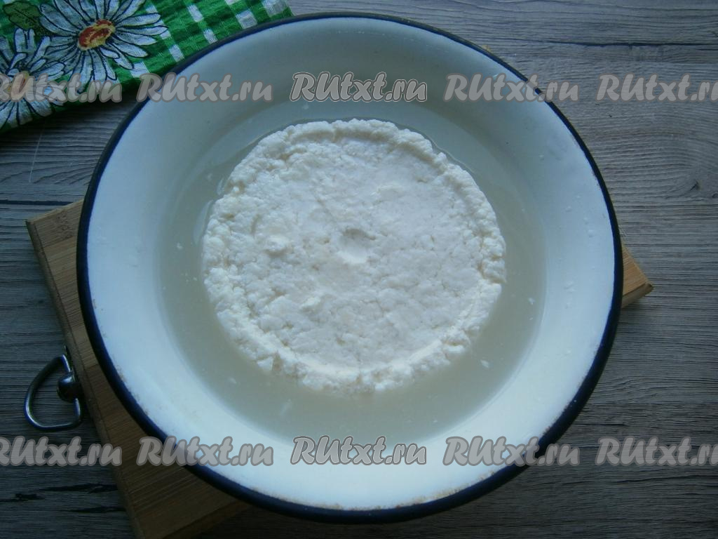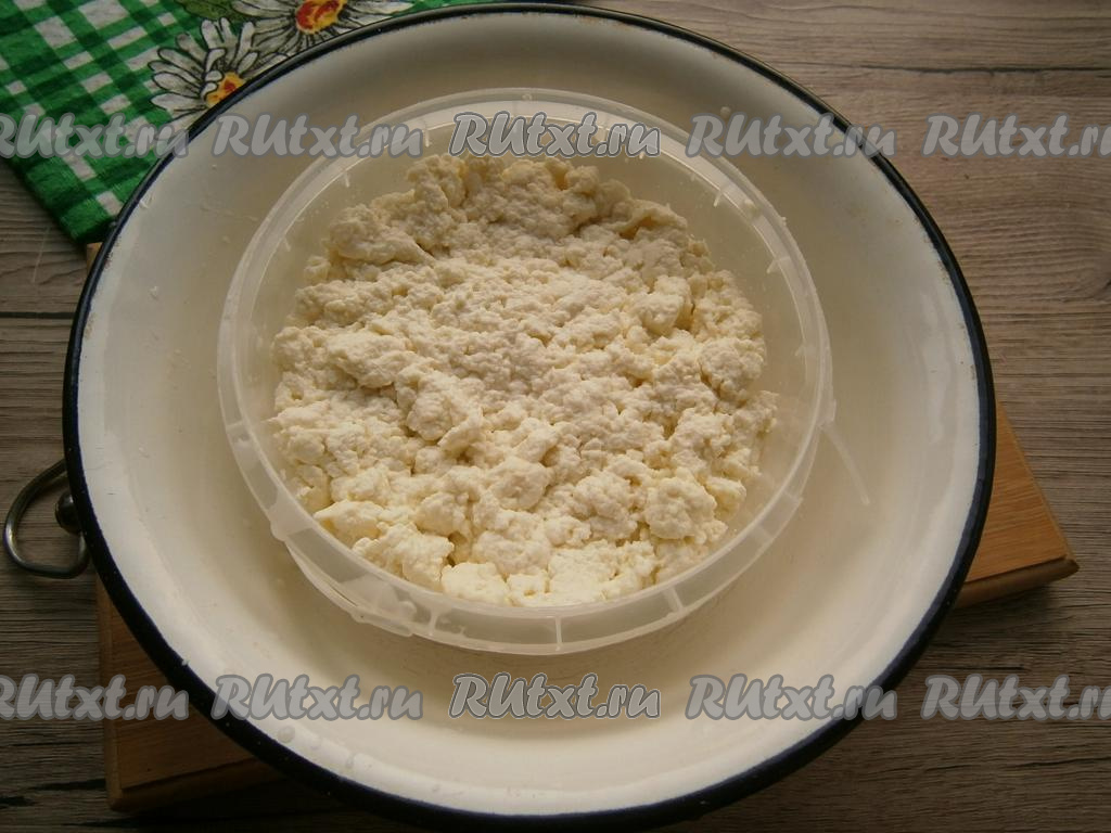 Отцедить творог от сыворотки через дуршлаг.