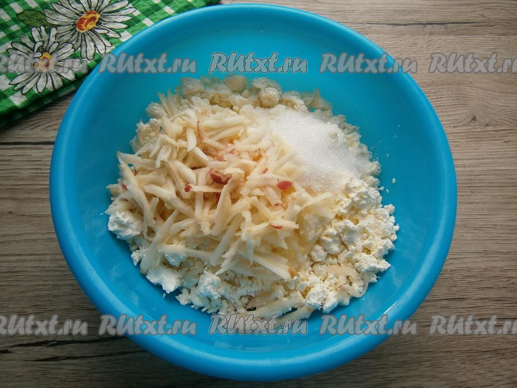 Добавить ванильный сахар, тщательно перемешать творожную массу. Очистить яблоко от кожуры и семян, натереть на крупной терке и выложить в творожную массу.